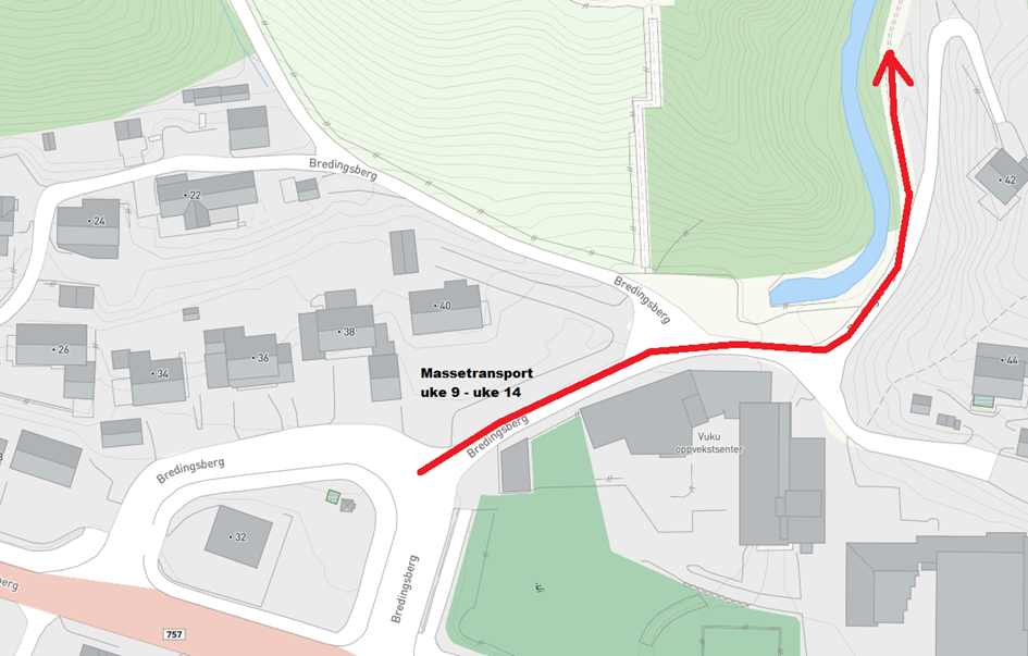 NVE vil kjøre inn store mengder stein, og transporten vil foregå på dagtid mellom kl. 07.00 og 18.00, mandag til torsdag. Ettersom det ligger en skole i umiddelbar nærhet, vil transporten bli planlagt til tidsrom med minst mulig trafikk til og fra skolen. Av hensyn til både framkommelighet og sikkerhet er det derfor ikke ønskelig med parkering bak skolen i anleggsperioden.
