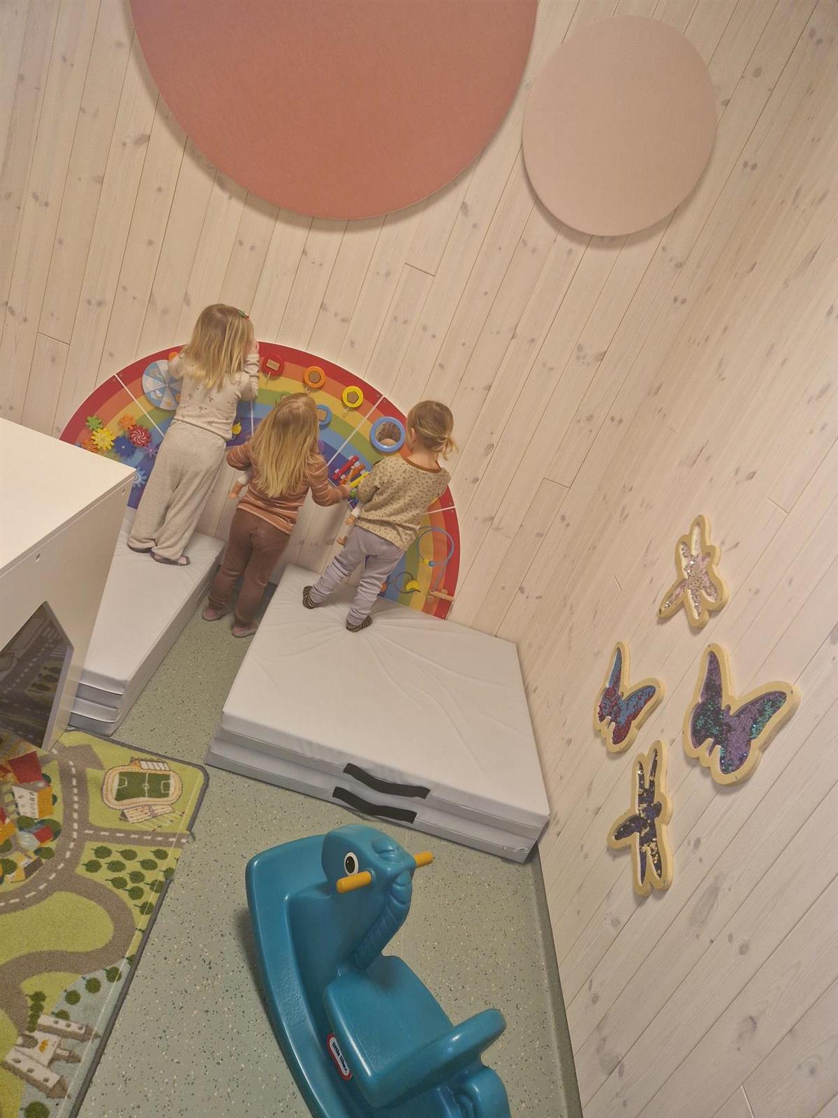 Lokalene er moderne, med nydelige farger og gode lys- og lydforhold. Vi er opptatt av god organisering og kvalitet i det pedagogiske arbeidet. Barnehagen har dyktige og erfarne ansatte som arbeider målrettet for å skape gode relasjoner og gi barna trygge rammer for lek, læring og utvikling.